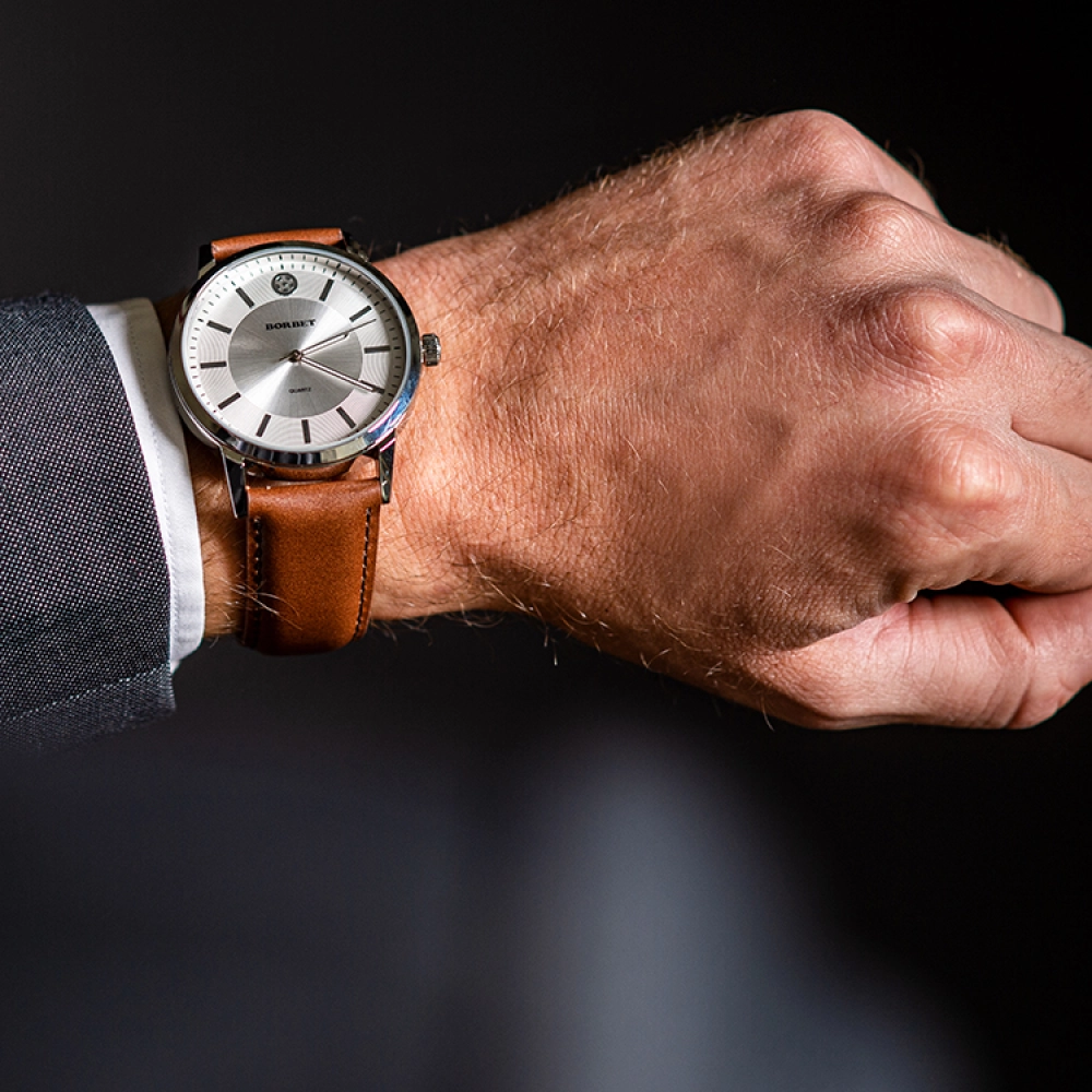 Diese schicke, zeitlose Herrenarmbanduhr mit einem braunen Lederarmband hat ein silbernes Zifferblatt mit minimalistischen BORBET Details. Sportlich elegant passt sie zu jedem Qutfit.